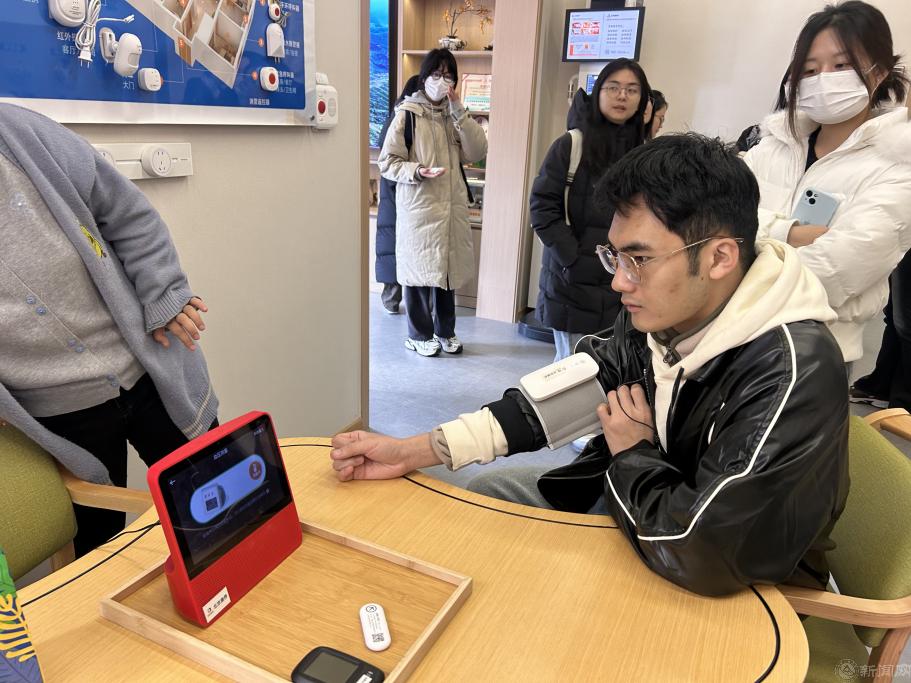 在养老服务中心工作人员的引导下,师生们先后参观了智慧健康监测区、适老化生活体验区、康养居住区及多功能公共服务区。同学们现场体验智能健康一体机及眼部监测设备,并借助远程诊疗系统实时对接三甲医院医生,深入感受智慧医疗在养老照护中的实际应用。在适老化模拟体验环节,大家佩戴专项装备,亲身感受老年人身体机能变化带来的日常生活挑战,增强对老年人的躬亲与理解。走进康养居住区,师生细致观摩了配备适老化家具、智能床垫与紧急呼叫系统的居住环境,切实体会科技如何为老年人构筑安全、便捷、温馨的生活空间。此外,师生还走访了社区食堂、老年学堂、文娱活动区等功能区域,系统了解了中心在“医、食、住、行、乐”等方面构建的全方位、人性化养老服务体系。座谈交流中,支部与养老服务中心就建立常态化志愿服务机制达成共识,未来将持续开展志愿活动,引导青年在服务奉献中践行使命、挺膺担当。